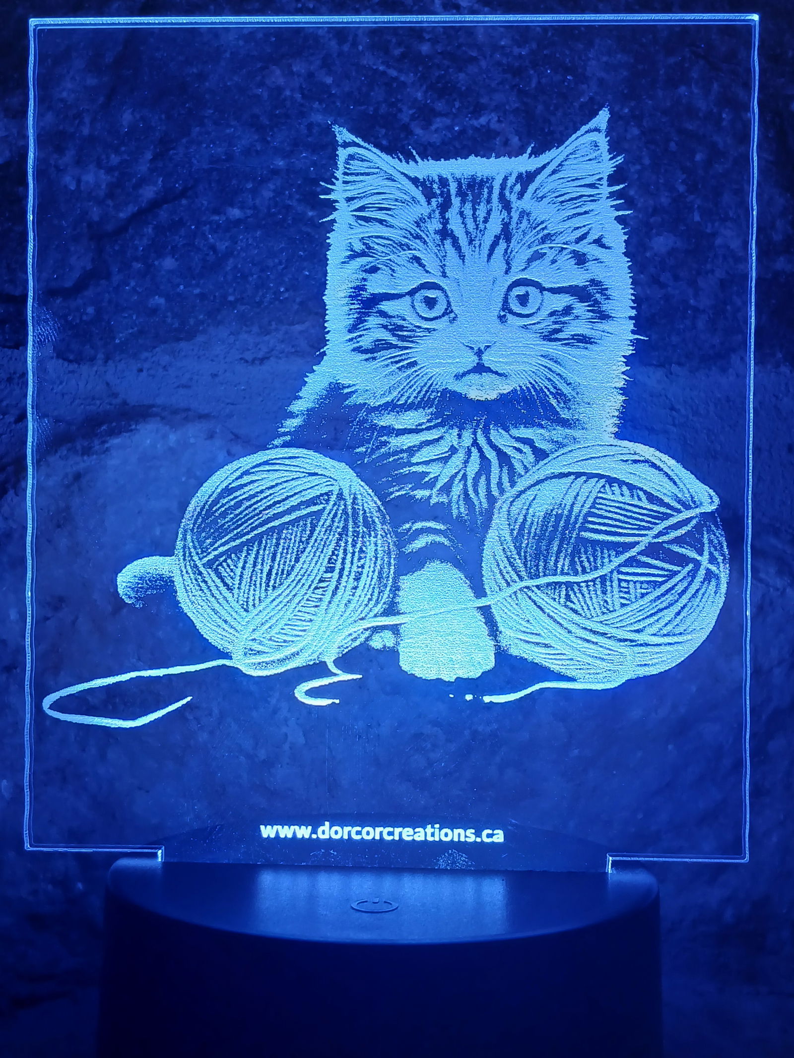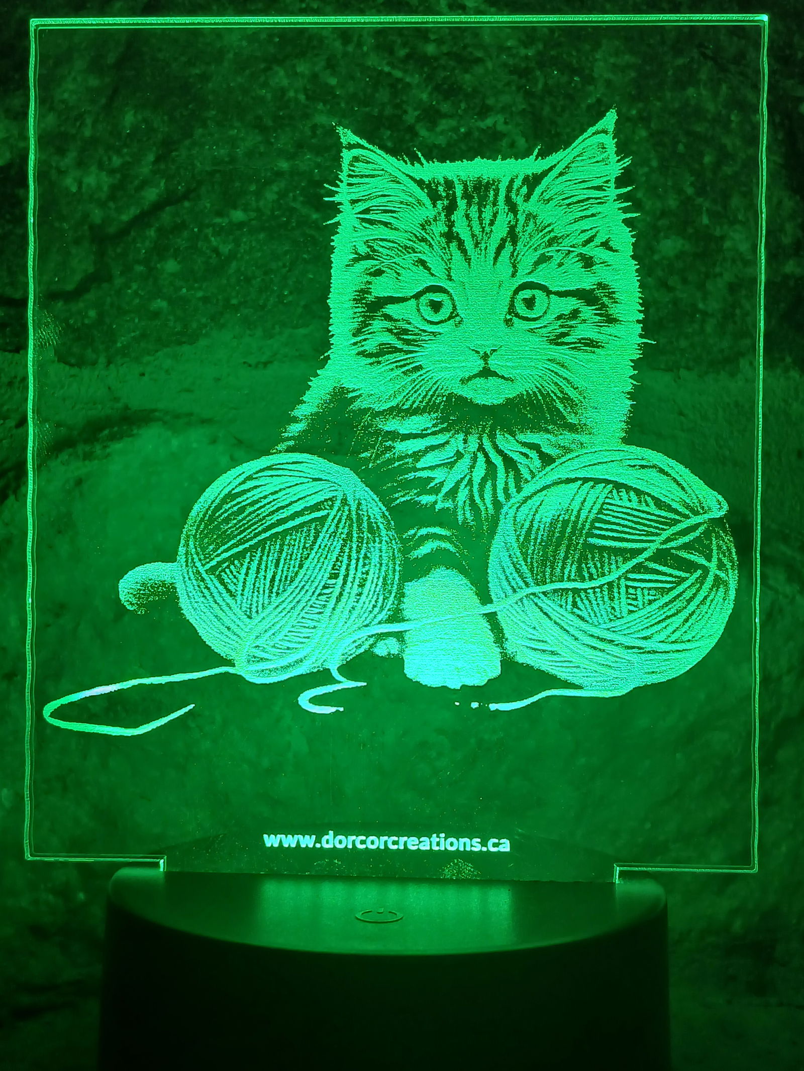 Add a touch of charm to any space with this Acrylic Kitten LED Light! Featuring a captivating engraved design of an adorable kitten surrounded by two detailed balls of yarn, this decorative light is perfect for cat lovers and cozy settings alike.