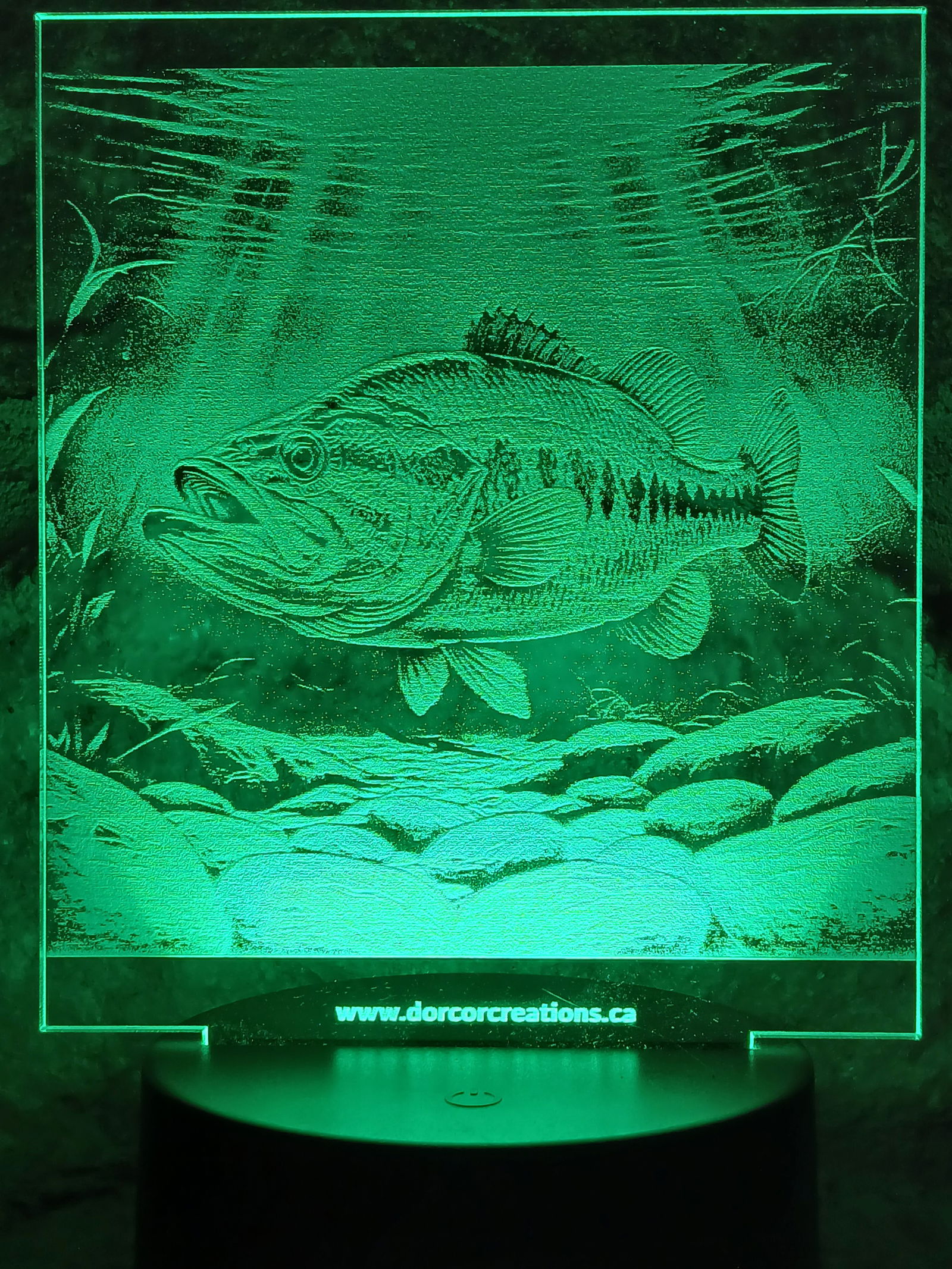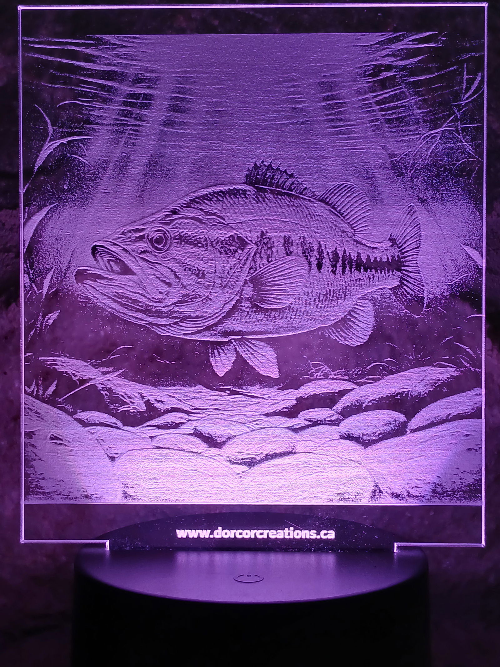 Make a splash with this stunning Acrylic Large Mouth Bass LED display! Perfect for any outdoor enthusiast or fishing lover, this piece features intricate etching of a large mouth bass in an underwater setting, complete with plants and rocks, all illuminated in vibrant LED lighting.